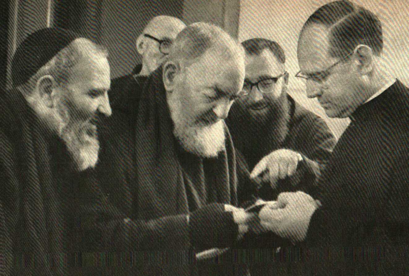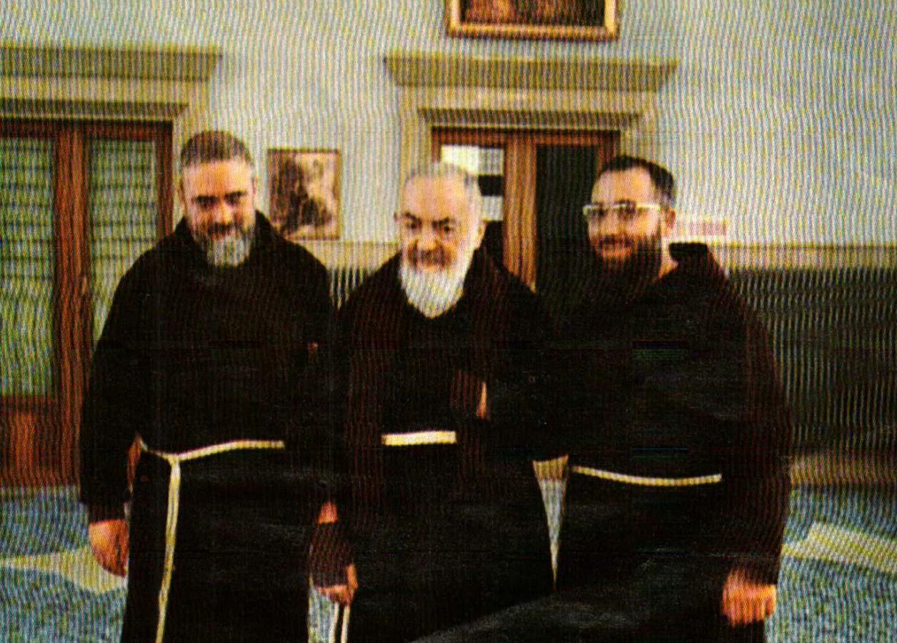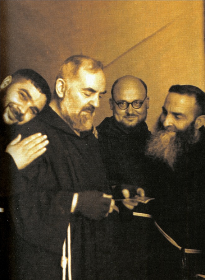 Padre Paolino da Nola (right) with Padre Pio. All are smiling.