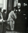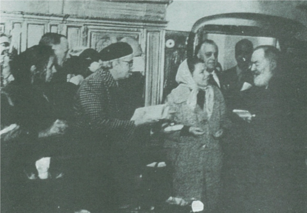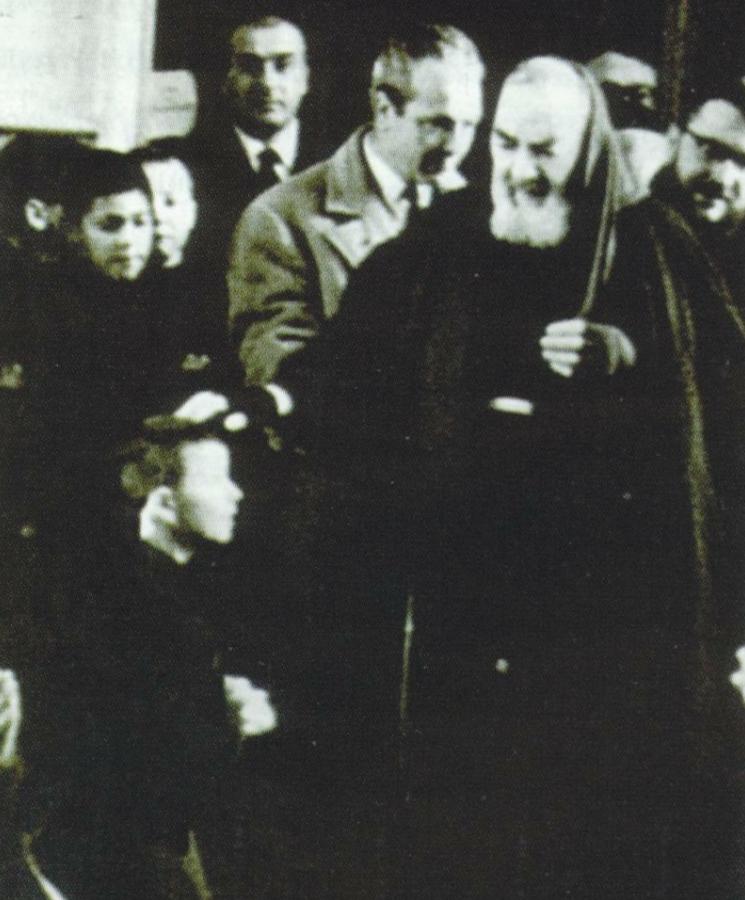 Dr. Salvatore Lorini, behind Padre Alessio, looking to his right. The group of men is from Castellammare di Stabia. Padre Pio in putting his hand on the head of the child Salvatore Lombardi.