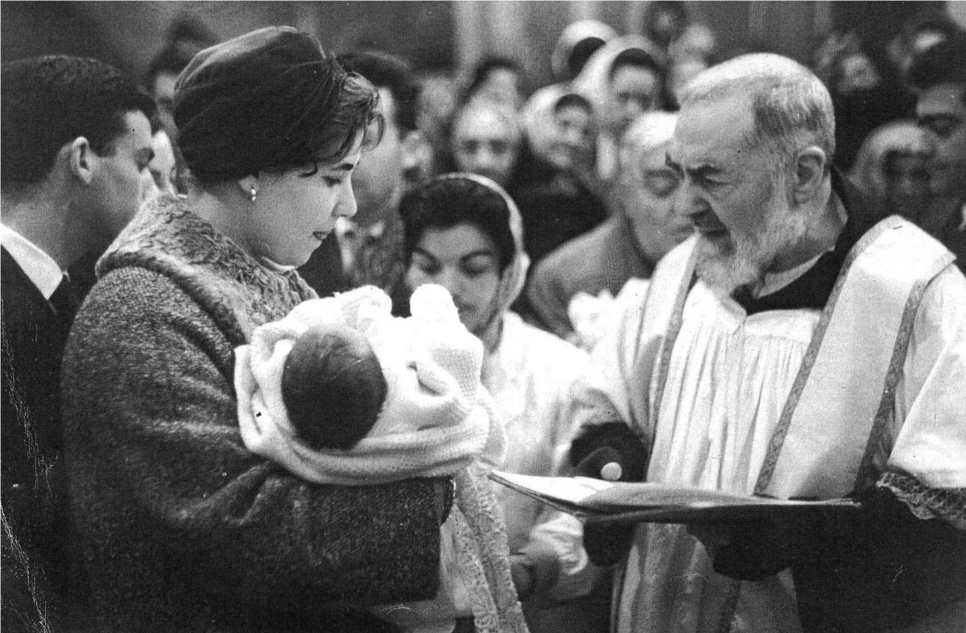 Children Carmelina Miglionico holding her child being baptized by Padre Pio. Baptism of Pio
