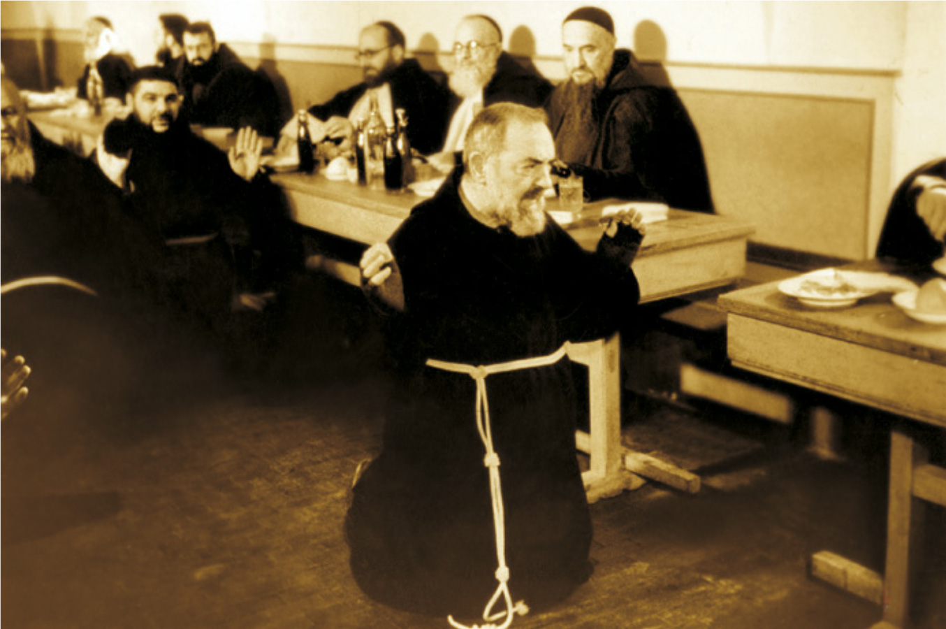 Two Refectories The original refectory. Padre Pio's place was on the right. It is marked by a sign and a picture of him. Near the entrance to the refectory of the friars. Padre Pio's intake of food was a remarkable exercise in temperance. He never had breakfast, seldom had dinner, and frequently joined the friars at lunch time. He ate no more then an ounce or two of food, once per day. His favorite food: broccoli rabe (broccoli di rape in italian) (vruoccl e rap in Neapolitan, his native language). He also had at times a sip of beer. Everything was in minuscule quantities, and shared with the other friars. The places were Padre Pio used to sit have now fresh flowers.The last picture shows Padre Pio testing the food of the workers at the hospital, during construction.