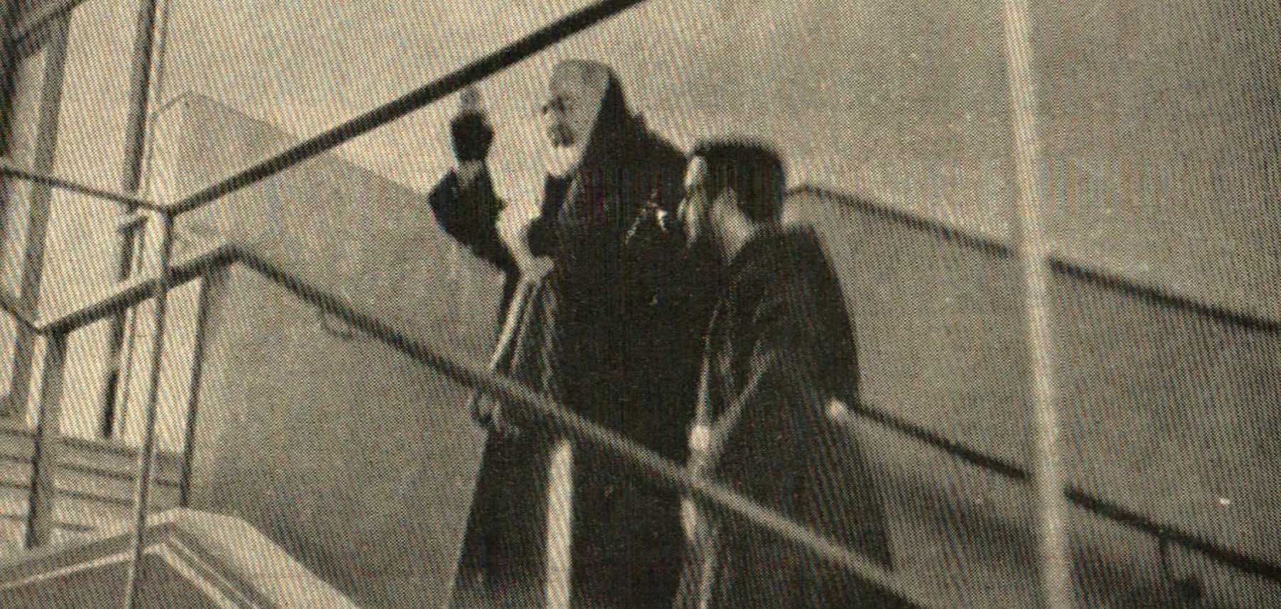 Padre Pio in prayer in the center back of the balcony (matroneo in Italian) facing the main altar of the new St. Mary of Graces church, and walking with the friars on the balcony.